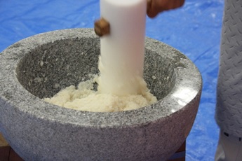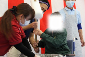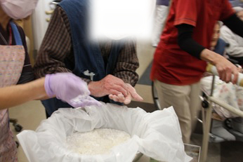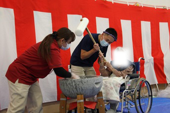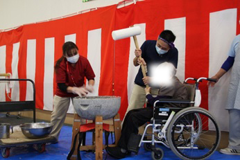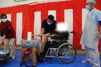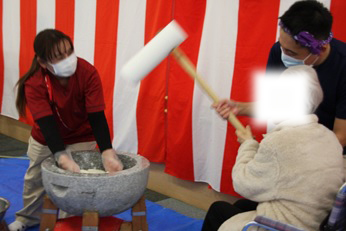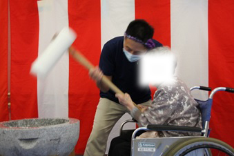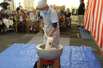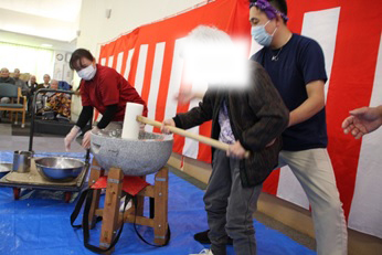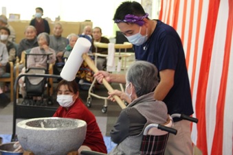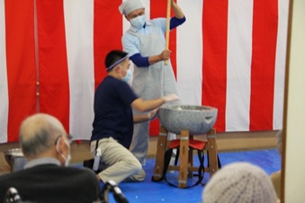 12月26日(金)に『もちつき大会』を行いました。石臼とプラスチック製の杵を使い、1回目は職員が餅つきを行い、2回目は、ご利用者の希望者による餅つき体験を行いました。体験したご利用者の方々は、嬉しそうな表情を浮かべ昔を懐かしんでいらっしゃいました。ついた餅は、鏡餅として施設内にお供えする予定です。