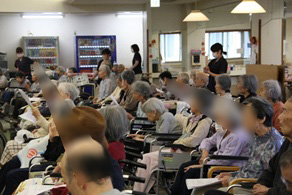 利用者の皆さんは、ハーモニークラブの皆様の演奏に合わせて、昔懐かしい昭和の歌曲を合唱し、それぞれ昔の思い出を呼び起こし合唱していました。ハーモニカのどこかもの悲しい響きと聞き覚えのある曲に、自然に口を動かしていました。