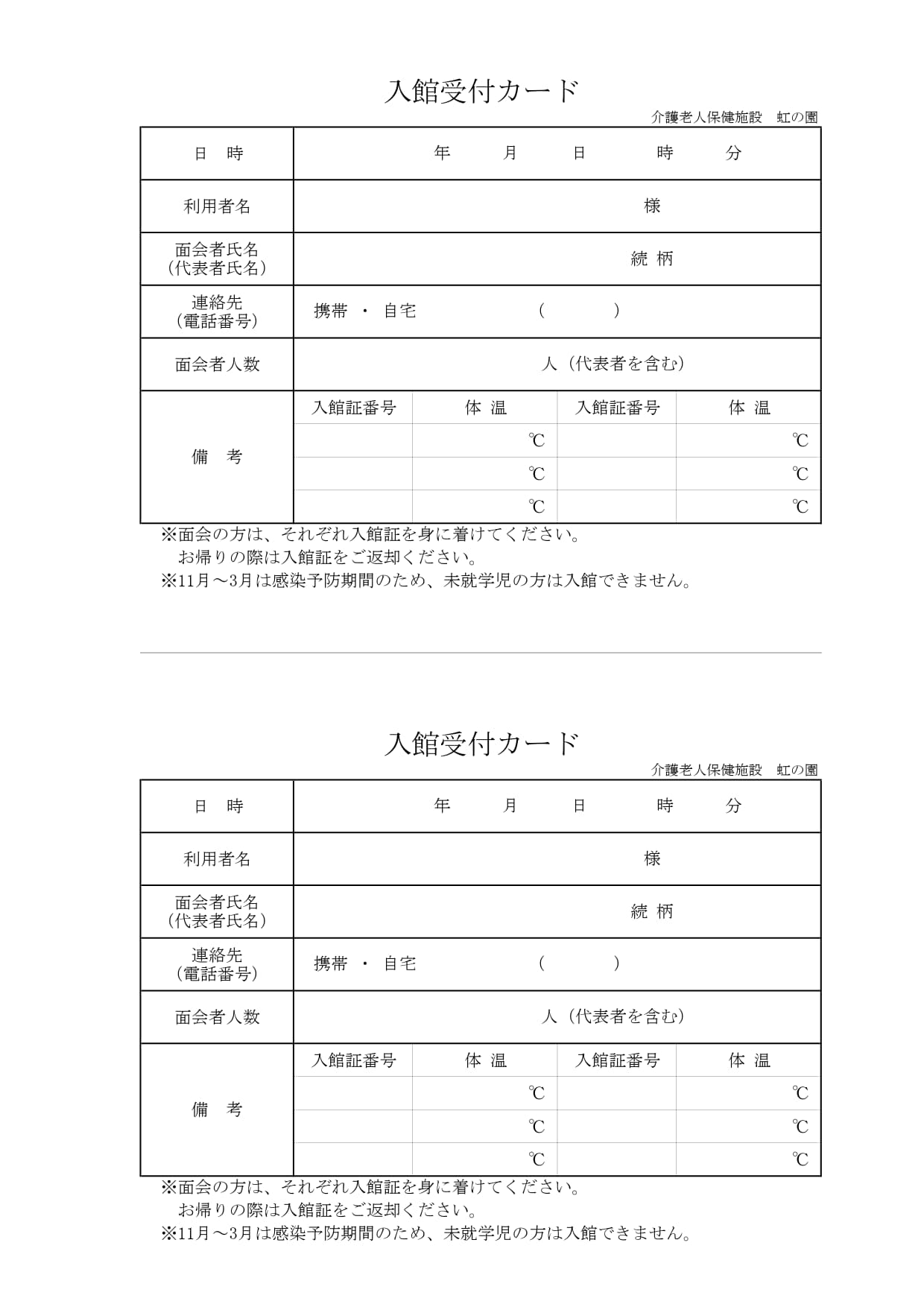 来園時に、入館受付カード用紙を自宅に持っていき、自宅で記入し持参できるようにしました。